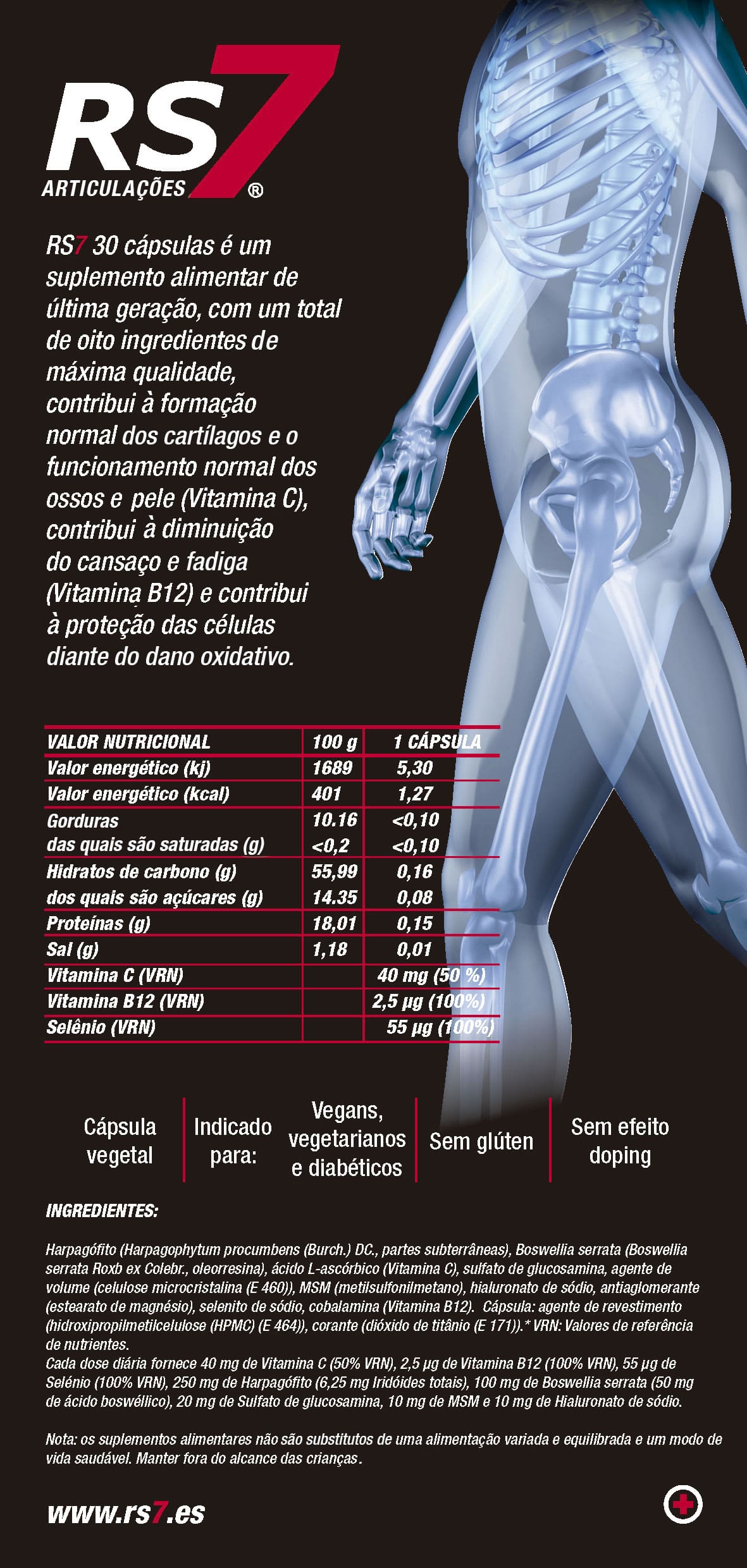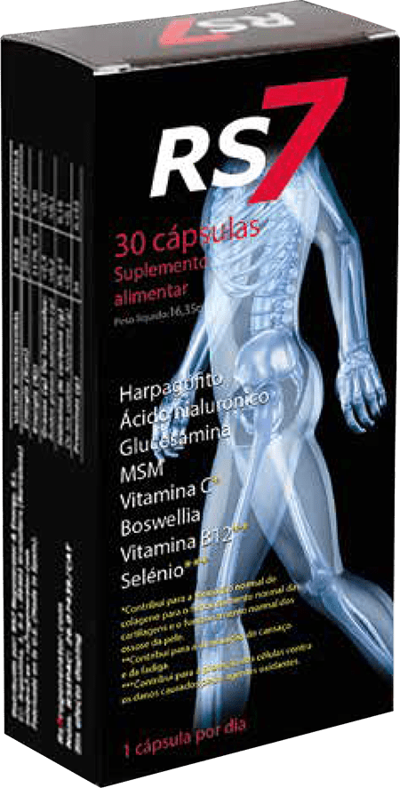 RS7 é um suplemento alimentar de última geração, com um total de oito ingredientes de máxima qualidade, contribui à formação normal dos cartílagos e o funcionamento normal dos ossos e pele (Vitamina C), contribui à diminuição do cansaço e fadiga (Vitamina B12) e contribui à proteção das células